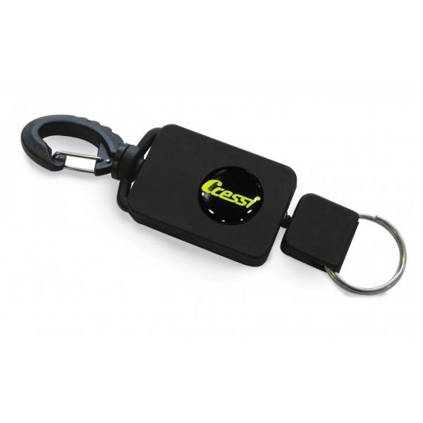 Mecanismo con cabo de acero retráctil para focos, cámaras o cualquier accesorio que se desee tener a mano y seguro. Mosquetón con ánima inox. para mayor seguridad.