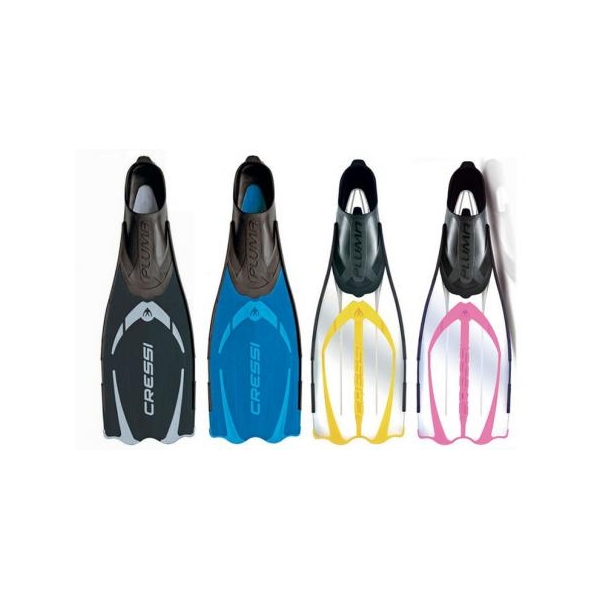 Pluma es una creación Cressi en aletas de gama alta para iniciación y snorkeling, fabricada con los mismos materiales que en la gama más técnica: polipropileno para la pala y caucho termoplástico muy flexible para el calzante y los nervios longitudinales. El polipropileno es ligero, resistente (garantizado