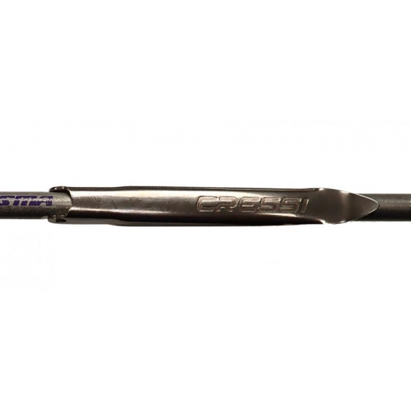 Aletilla en acero inox de muelle AISI 301 de 0,8 mm de espesor. Resistencia mecánica 1269 Nw/mm2 cercana a la de la propia varilla. Pasador y orificio proporcionados al diámetro de la varilla entre 2 y 2,5mm. Longitud en proporción a la varilla; 55 mm en medidas de 90 a 120 cm y 70 mm de 130 a 150 cm. Aletilla a dos volúmenes, estudiada para una máxima penetarción hidrodinámica. Montaje con una ligero rebaje de 1cm de longitud que integra en el perfil los remaches y mejora notablemente el alcance de la varilla. El rebaje no supone merma de resistencia ya que el pasador de aleta está proporcionado según diámetro de la varilla. Tórica de cerrado de la aletilla de serie (color rojo).