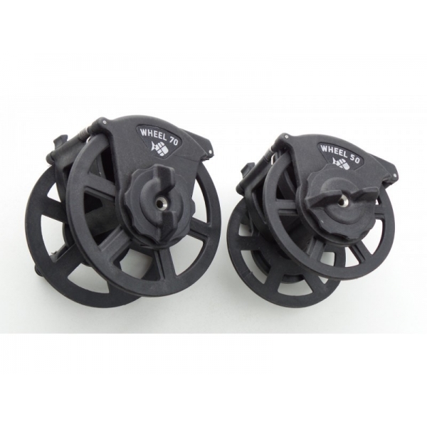 Vertical : El tornillo que fricciona y la bobina tienen el interior de la rosca en acero. Dotado de un sistema easy-release que permite liberar todo el hilo de golpe en caso de necesidad por una gran captura. Todos los puntos de desgatse son de acero. La manivela es retráctil gracias a un muelle. Con una capacidad de 50,70m de hilo de 2mm.
