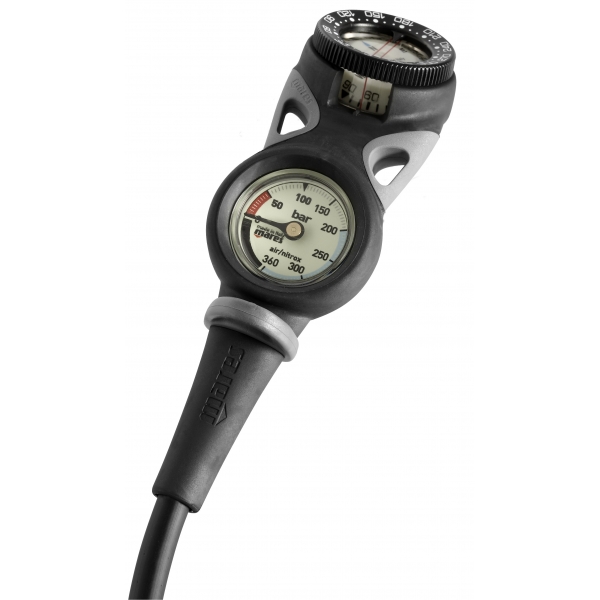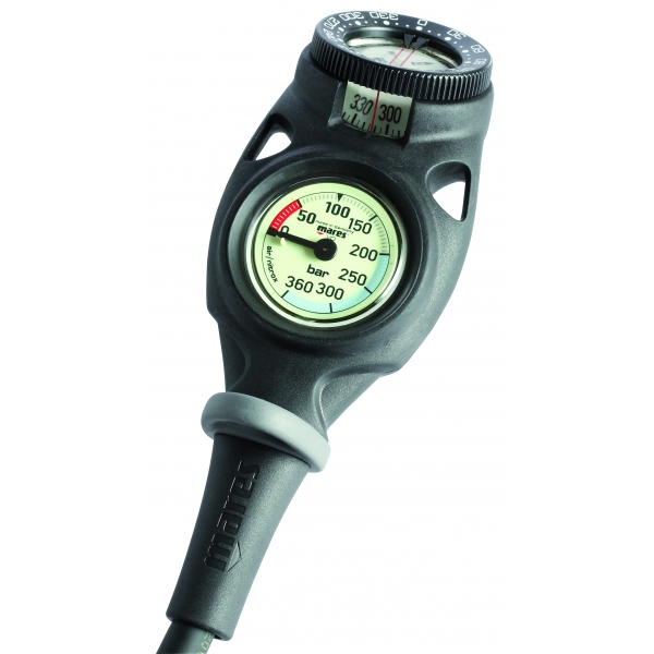 Consola analógica con manómetro y brújula, con ángulos optimizados para la lectura simultánea de ambos instrumentos.