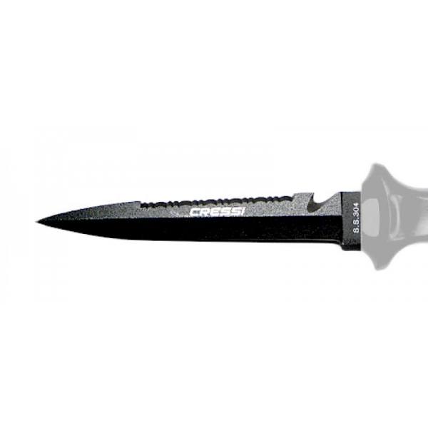 Acero AISI 304 templado y recubrimiento Black Coating. La duración de estas prestaciones está garantizada no ya por el afilado en sí sino por la calidad del material que garantiza la durabilidad del filo. Sección romboidal para una gran resistencia a la flexión y la rotura. Hoja con un lateral con filo liso y otro con filo dentado.