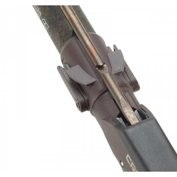 Nuevo cabezal completamente redondeado con nuevo diseño para permitir la rápida recolocación de la varilla tras el disparo sin necesidad de que ésta entre longitudinalmente respecto al tubo. Compacto, minimalista e hidrodinámico. El enganche de las gomas está en eje con el tubo para que la tracción se realice perfectamente en eje. La visibilidad ofrecida por el cabezal es excelente y la maniobra de apuntar resulta precisa, rápida e intuitiva. Guía para el cabo o nylon en acero inoxidable integrada en el cabezal,