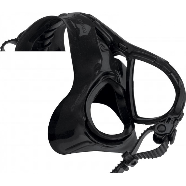 Su montura de reducido espesor en una sola pieza, sin cercos, permite una gran ligereza (118 g) y un sorprendente acercamiento del cristal a los ojos con las consiguientes ventajas en cuanto a visibilidad y reducción del volumen interno.