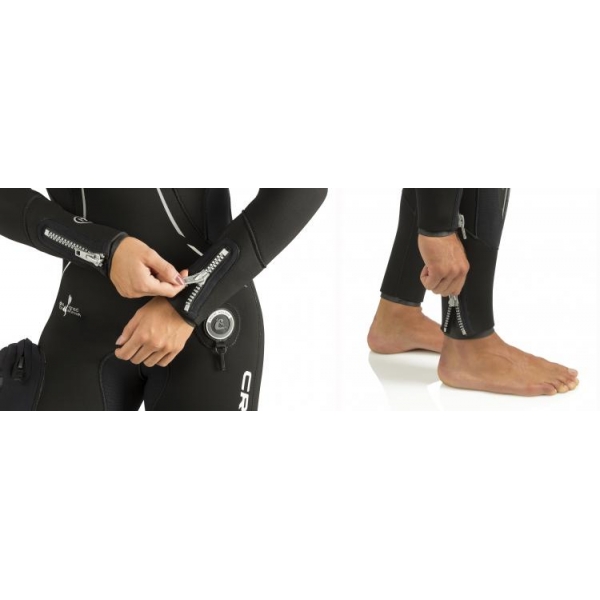 Estanqueidades en muñecas y tobillos mediante dobles manguitos interior Glide Skin + Liso (para evitar que se adhieran cuando no se usa) y cremalleras.
